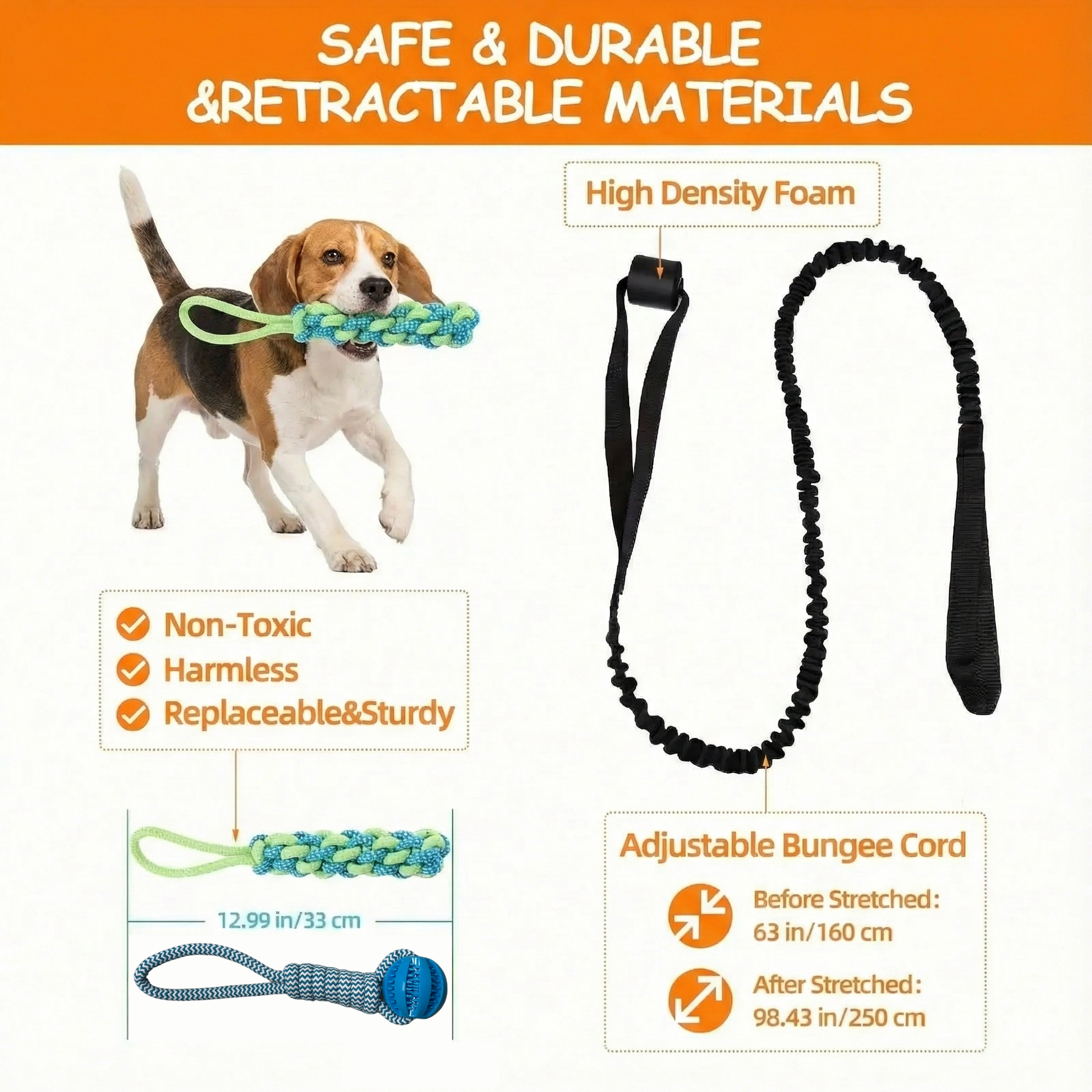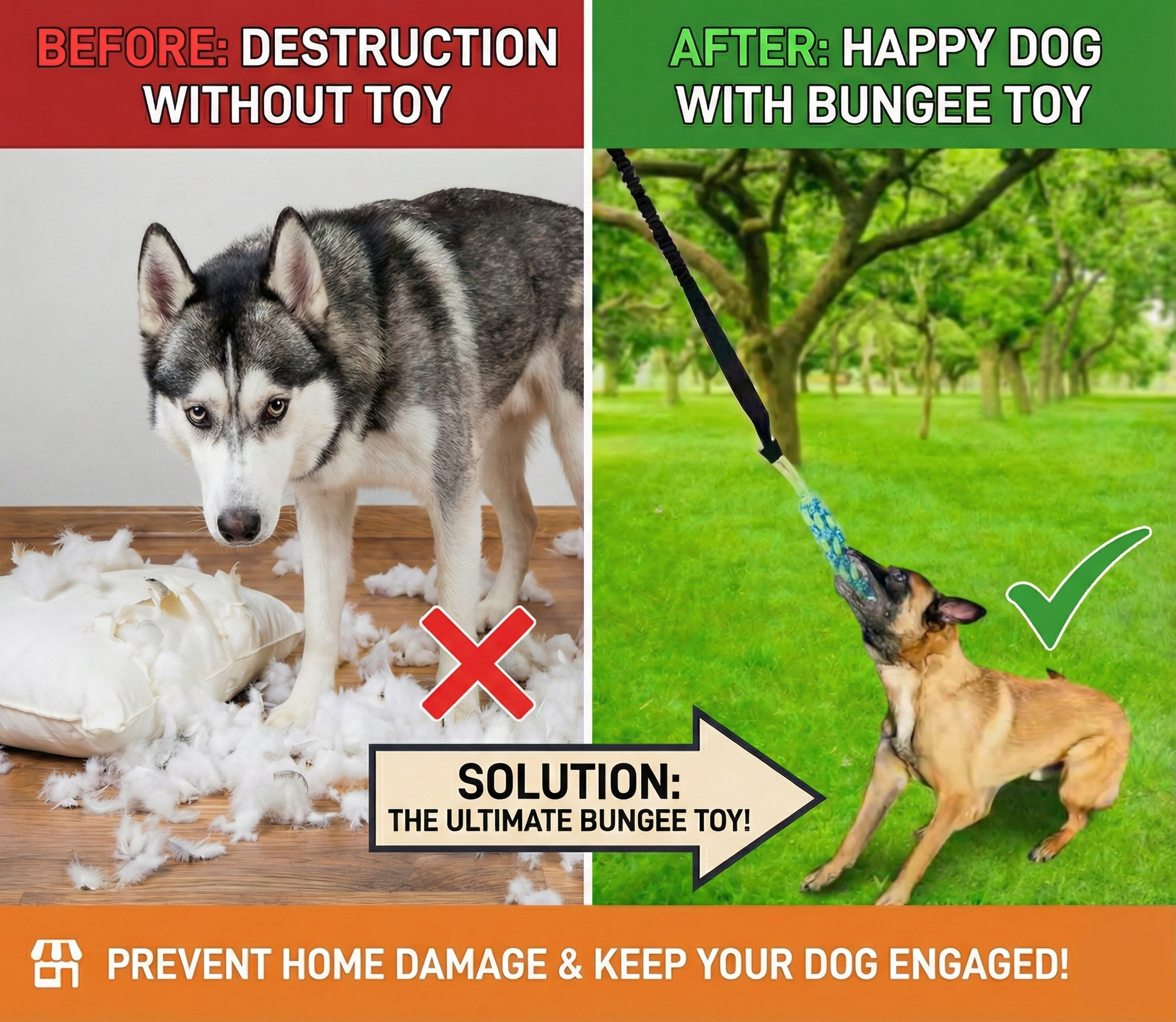 The bungee cord provides resistance that tires your dog out without the hard impact of rigid toys. It builds muscle and relieves separation anxiety safely. Always supervise your pet during play.